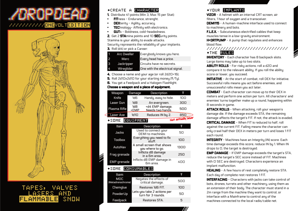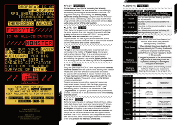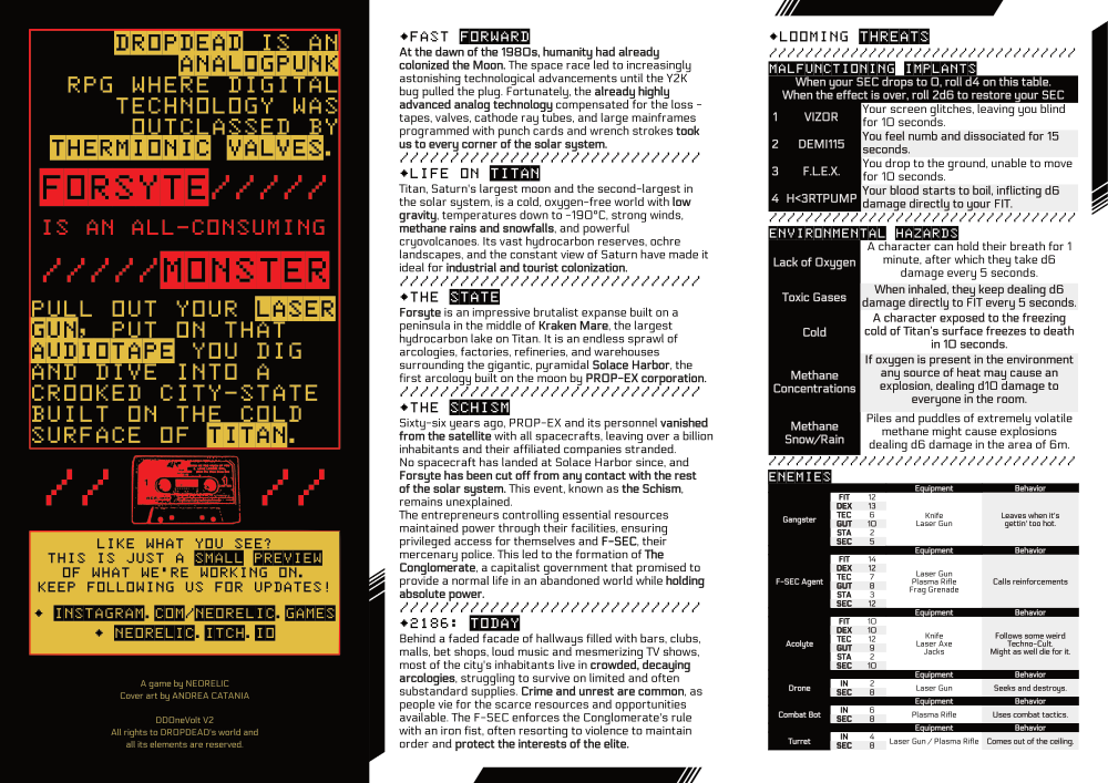 DROPDEAD is an analogpunk role-playing game set on Titan, Saturn's largest moon. Here, people live in the arcologies of an off-world city, mysteriously isolated from the rest of the Solar System.
